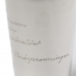 Высота: 9,5 см, диаметр верха: 5,8 см, объем: 170 мл. Вес: 58 граммов серебра 830 пробы.