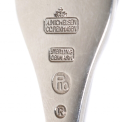 Mark of the designer. «A.MICHELSEN Sterling Danmark» - mark, confirming that the item is made in Danish workshop, of the supplier of the Danish royal court, and has the sterling silver. Each year since 1910 the eminent Danish manufacturer of silverware A. Michelsen produces the Christmas Spoon and dessert sets, consisting of spoons and forks. Danes, and not only they, traditionally include the cutlery of this series in Christmas gifts for the relatives. The most interesting Danish designers, painters and sculptors become the authors of design of these collection cutlery.