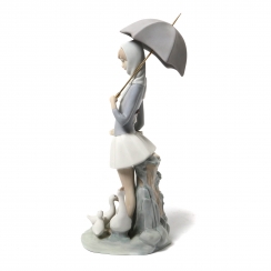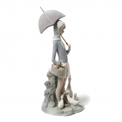 Фарфоровая фигура (статуэтка) "Девушка под зонтом с гусями". Ручная подглазурная роспись.