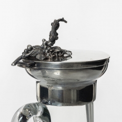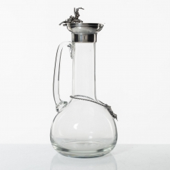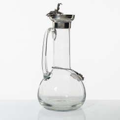 Кувшин (графин) с табличкой. Стекло, серебро 925 пробы. Изогнутая форма с узким горлышком, ручкой и откидной крышкой, увенчанной гроздью винограда. На горлышке висит табличка (лейбл) на цепочке для указания вида напитка.