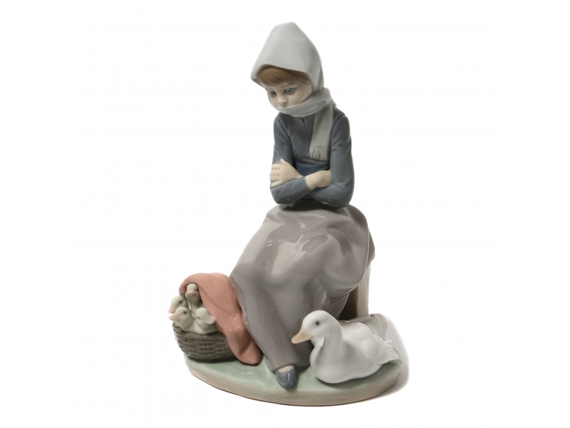 Фарфоровая фигура (статуэтка) "Девочка с уткой и утятами в корзине". Ручная подглазурная роспись.