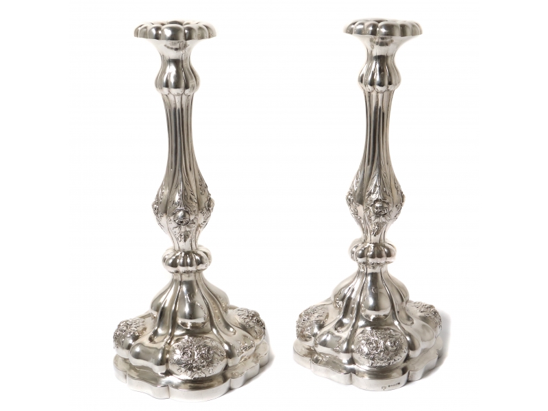 Высота 36 см, размер основания: 14 х 14 см, диаметр отверстия для свечи: 2,5 см. Общий вес с небольшим утяжелением: 1371 грамм серебра 830 пробы. =============================== Silver candlesticks, 2 pcs, decorated with relief roses.