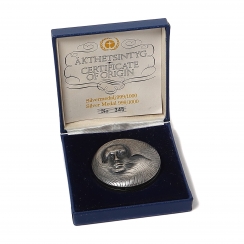 Диаметр: 5 см. Вес: 296 граммов серебра 999 пробы.