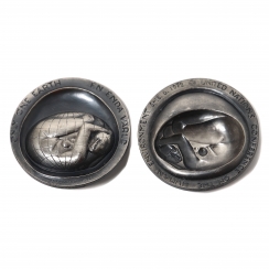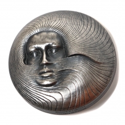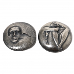 Obverse: A human face protruding from a spherical surface. Reverse: A nude human figure in the fetal position, symbolizing the Earth.