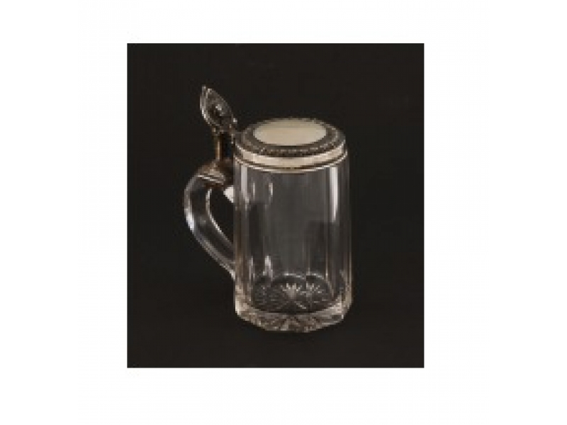 Стеклянная кружка с откидной серебряной крышкой, серебро 830 пр, Швеция. Высота по верх кружки 14,2 см, диаметр основания 14,5 см, диаметр верха 7,2 см