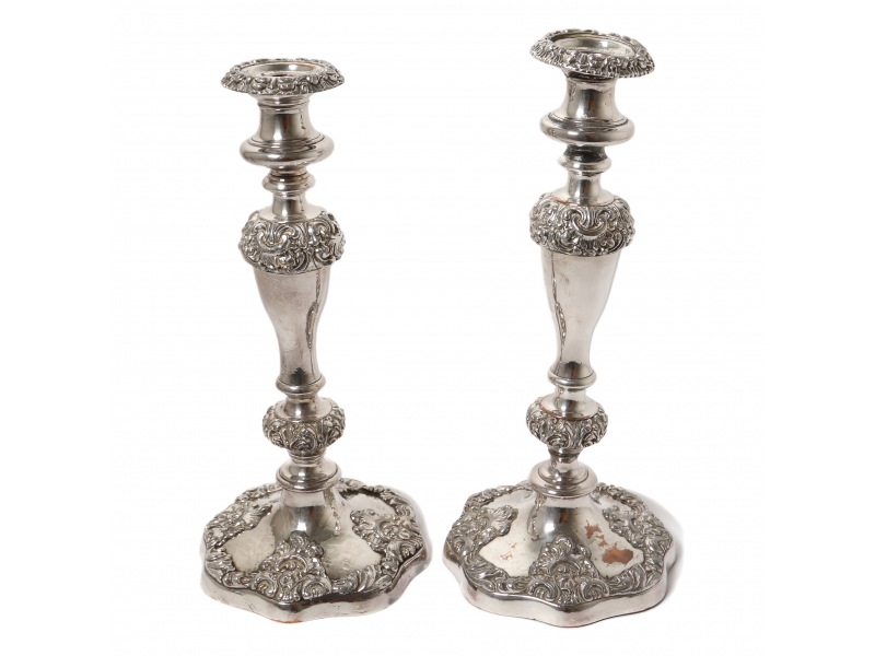 Потертости на серебряном покрытии (проступает металл медного цвета), у одного из подсвечников вмятины на полях профитки. ============================ Silver plated candlesticks, 2 pcs, decorated with a relief floral pattern.
