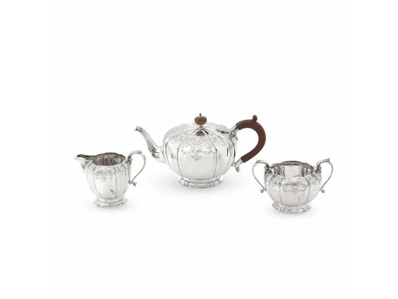Чайный сервиз, 3 предмета, Англия, общий вес 1611 гр, 925 пр Высота чайника по хватку на крышке 14,5 см, диаметр основания 10 см Высота сахарницы по край чаши 7,5 см, диаметр верха 7,7 см, диаметр основания 7,5 см Высота молочника по носик 9,3 см, диаметр основания 6,5 см