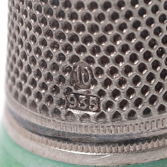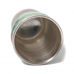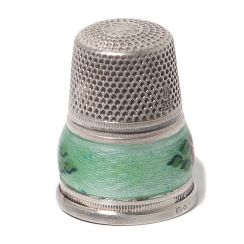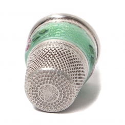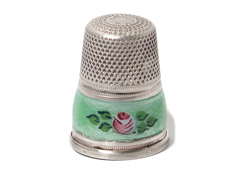 Серебряный наперсток с гильошированной эмалью, декорированный росписью в виде розы и листьев.
