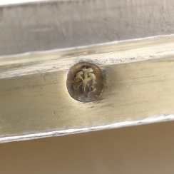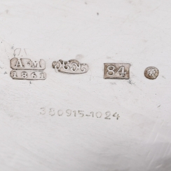 The Russian hallmarks of the 19th century, where: "АМ" - the initials of the assay master Mitin Alexander Nikolaevich (worked since 1842 to 1877); "1861" - year of assay; "84" – the fineness mark (84 zolotniks = 875); "two anchors, laid crosswise and scepter" - the Petersburg city mark.