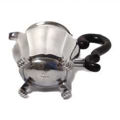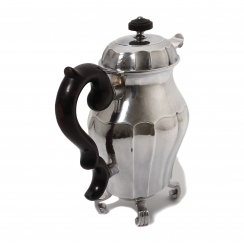 The lacquer coating on the coffee pot handle is scuffed. There is an engraving on the bottom.