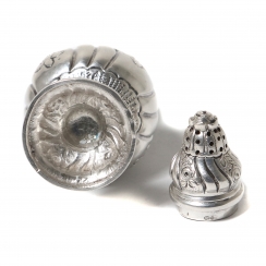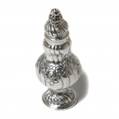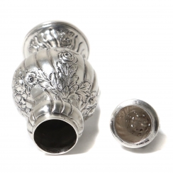 Высота: 9,5 см, диаметр основания: 3,2 см. Вес: 65 граммов серебра 835 пробы. =============================== Silver salt shaker, decorated with floral ornaments.