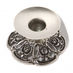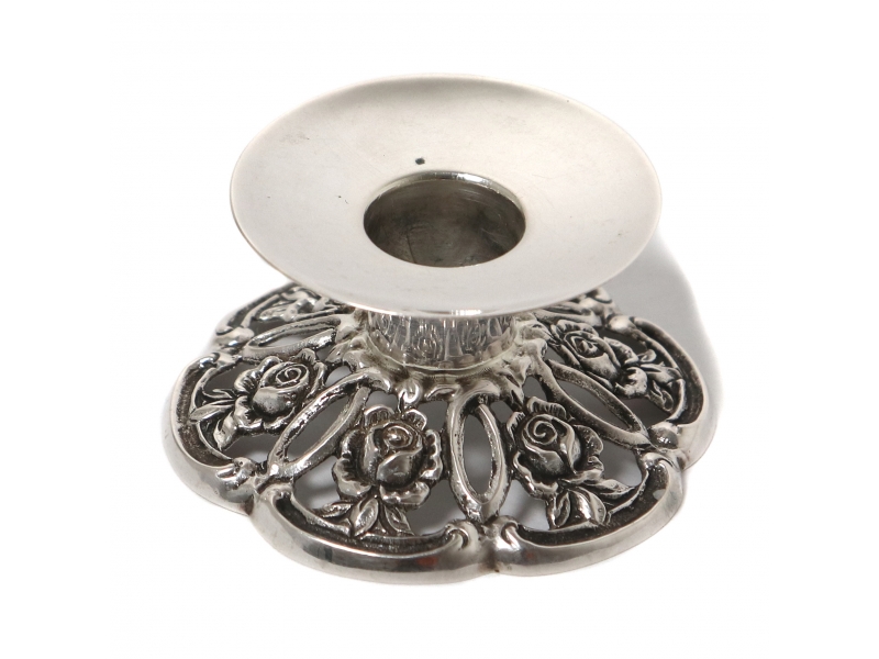 Высота: 2,8 см, диаметр основания: 5,2 см, диаметр верха: 3,8 см, диаметр отверстия для свечи: 1,3 см. Вес: 22 грамма серебра 835 пробы. ============================= Silver candlestick. Pattern "Rose of Hildesheim".