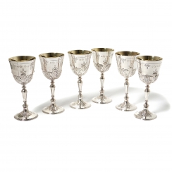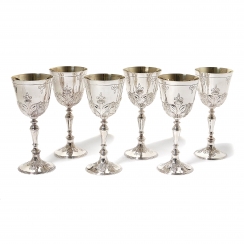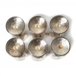 Размеры коробки: 39 х 29,5 х 11 см. =============================== Silver wine glasses (goblets), 6 pcs, decorated with floral patterns. In the box.