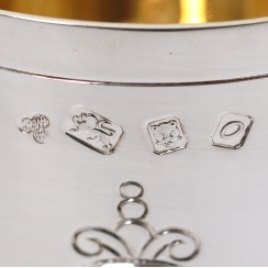 Высота: 16,2 см, диаметр основания: 6,5 см, диаметр верха: 7 см. Объём: 140 мл. Общий вес: 1369 граммов серебра 925 пробы.
