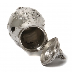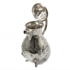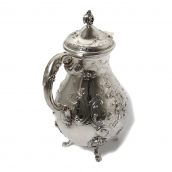 Серебряный кофейник, декорированный сюжетной миниатюрой и растительным узором.