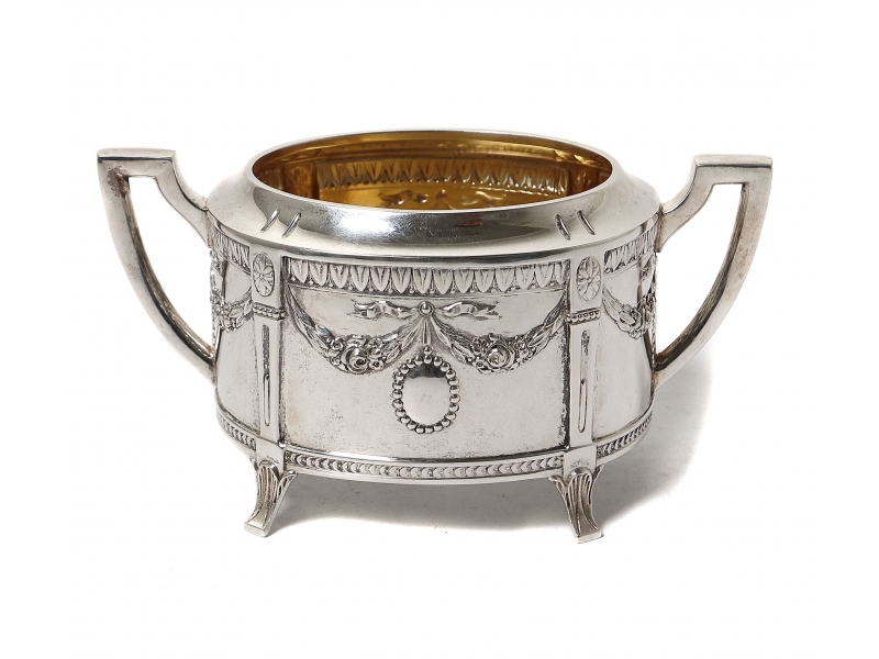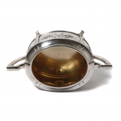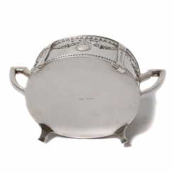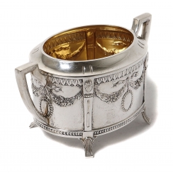 Максимальная высота: 8,5 см, длина: 16,5 см, ширина: 8 см, размеры верха чаши: 8,8 х 7 см. Вес: 237 граммов серебра 830 пробы. ========================== Silver sugar bowl.
