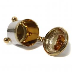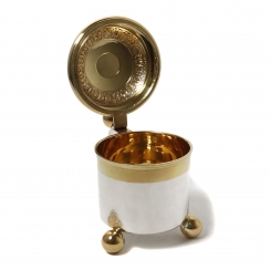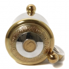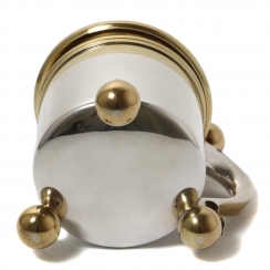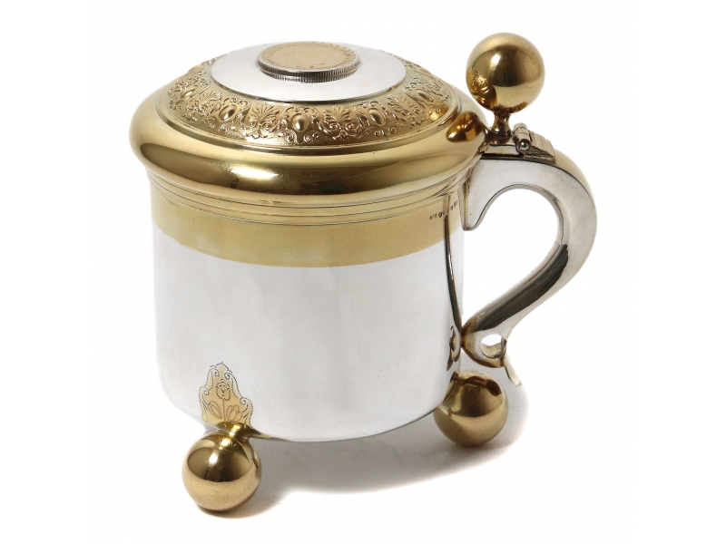 Серебряная кружка с откидной крышкой на ножках-шарах. Позолота. На крышке медальон с профилем короля Швеции Густава V (годы правления: 1907 - 1950).