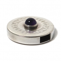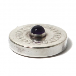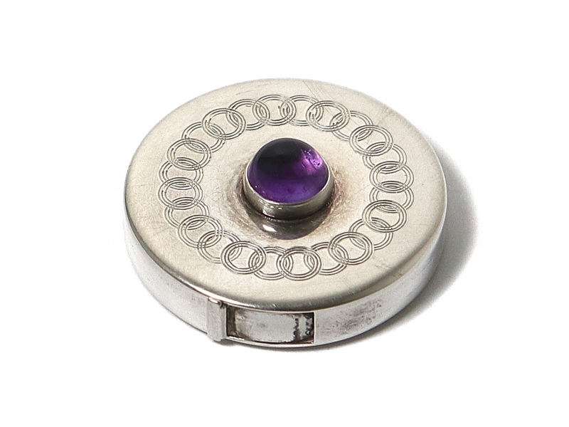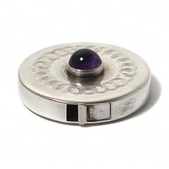 Серебряная таблетница для порошков, сбоку расположена задвижка. Крышка украшена вставкой из фиолетового аметиста в форме кабошона.