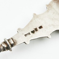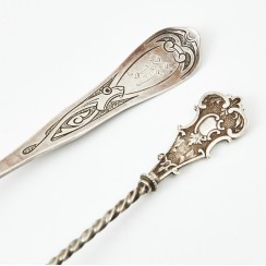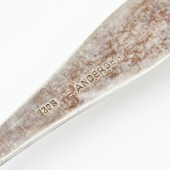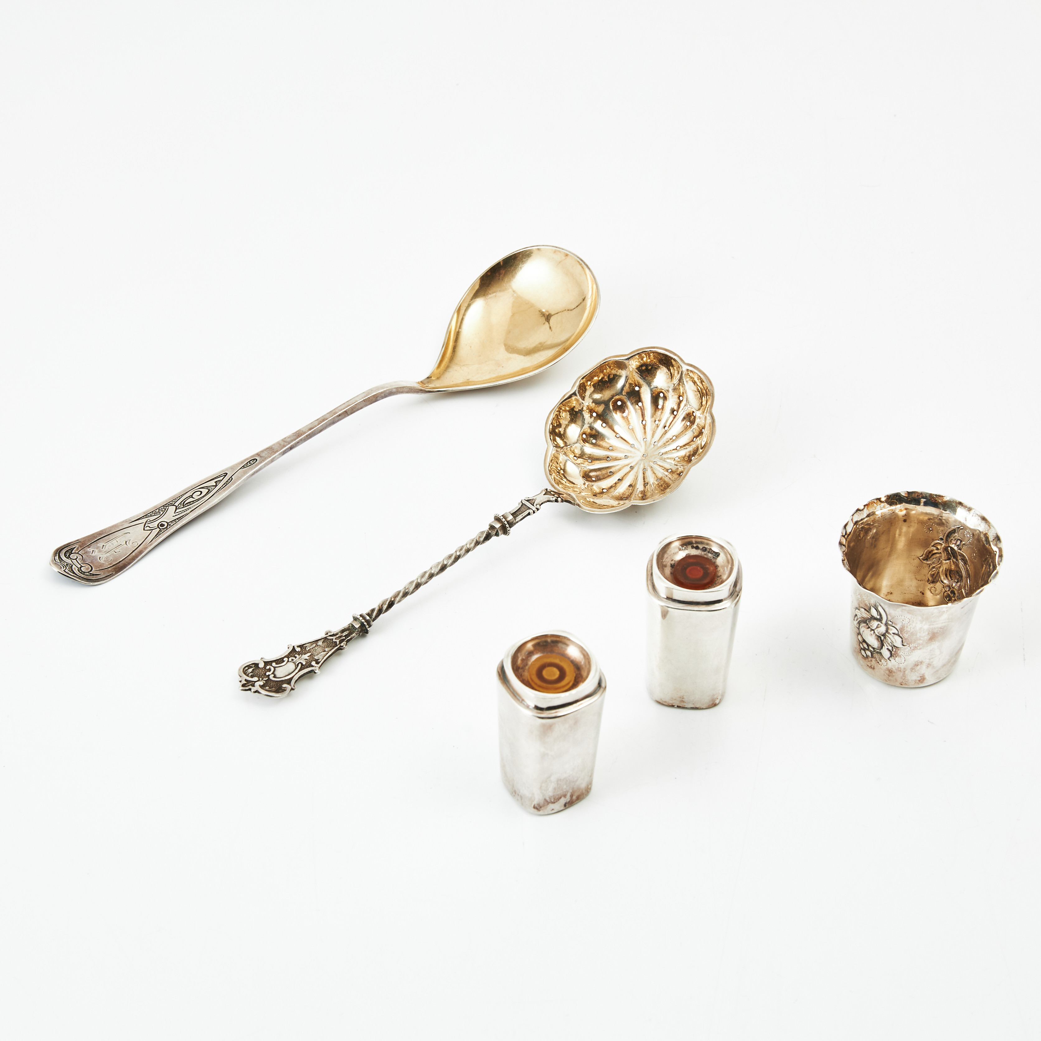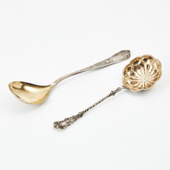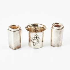 355411 - Стопка, 22 гр, 830 пр, высота 5 см, диаметр верха 5,5 см 392577 - Ситечко, 42 гр, 830 пр, длина 21,2 см 358645 - Сервировочная ложка, 55 гр, 830 пр, 24,4 см 396908 - Солонка и перечница, 89 гр, 830 пр, высота 6 см, максимальная длина 3,3 см, ширина 3,3 см