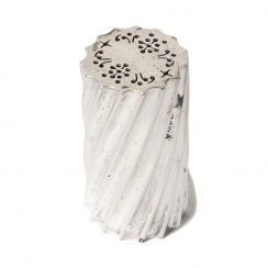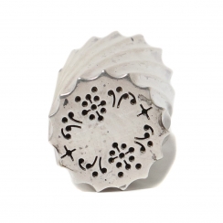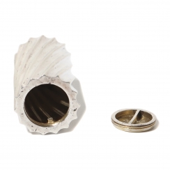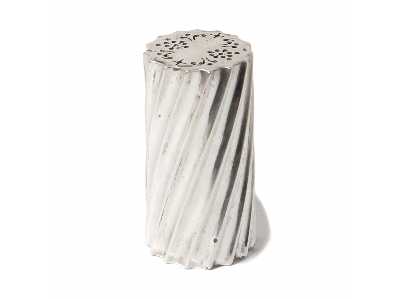 Серебряная солонка. Тулово имеет спиралевидные желобки. Крышка украшена перфорацией в виде цветов и орнаментов.