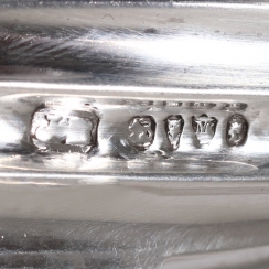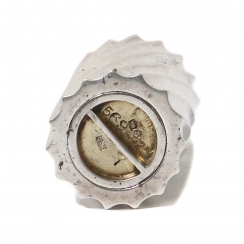 Высота: 6 см, диаметр основания: 3 см, диаметр: 3 см. Вес: 42 грамма серебра 925 пробы. =============================== Silver salt shaker. The body has spiral grooves. The lid is decorated with perforations in the form of flowers and ornaments.