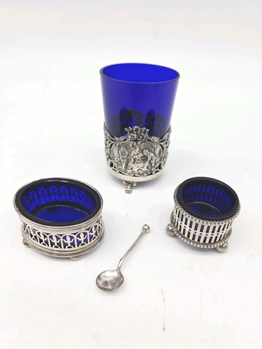 187955 - Подставка или ваза. Кобальтовое стекло, серебро 934 пробы. Голландия. Вес без стекла 40 гр. Высота 9 см, диаметр верха 5,2 см 393289 - Прорезная солонка с кобальтовой вставкой, Англия, вес без стекла15 гр, 925 пр, длина 5,4 см, ширина 4 см, высота 3,2 смбез стекла 211540 - Прорезная солонка с кобальтовой вставкой и ложкой, Германия, вес солонки без стекла 17 гр, 830 пр, диаметр 4 см, высота 3,2 см, длина ложки 5,3 см