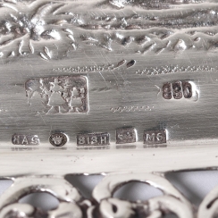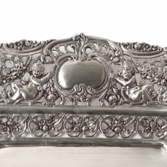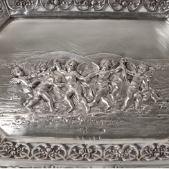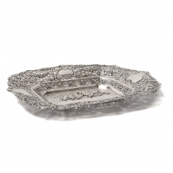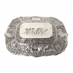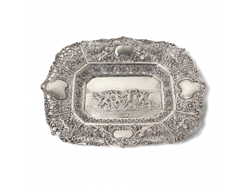 Длина: 24,3 см, ширина: 19,7 см, высота: 2,8 см. Вес: 269 граммов серебра 830 пробы. ========================= Silver open-work bowl with putti.