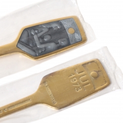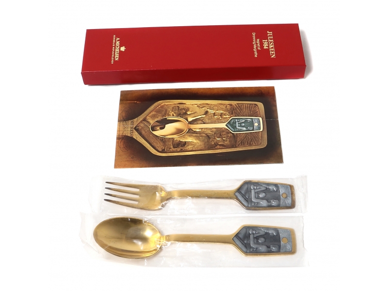 Клеймо дизайнера. «A.MICHELSEN Sterling Danmark» - клеймо, удостоверяющее, что изделие произведено в датской мастерской Антона Михельсена, поставщика Датского королевского двора, из стерлингового серебра. С 1910 года именитый датский производитель столового серебра A.Michelsen выпускает каждый год так называемую Christmas Spoon, а также десертные наборы, состоящие из ложки и вилки, которые традиционно датчане, да и не только, включают в рождественские подарки близким. Авторами дизайна становятся наиболее именитые датские дизайнеры, художники, скульпторы. ================================== The Danish сollection annual dessert spoon and fork "Solstice and Family". Silver, gilding, enamel.