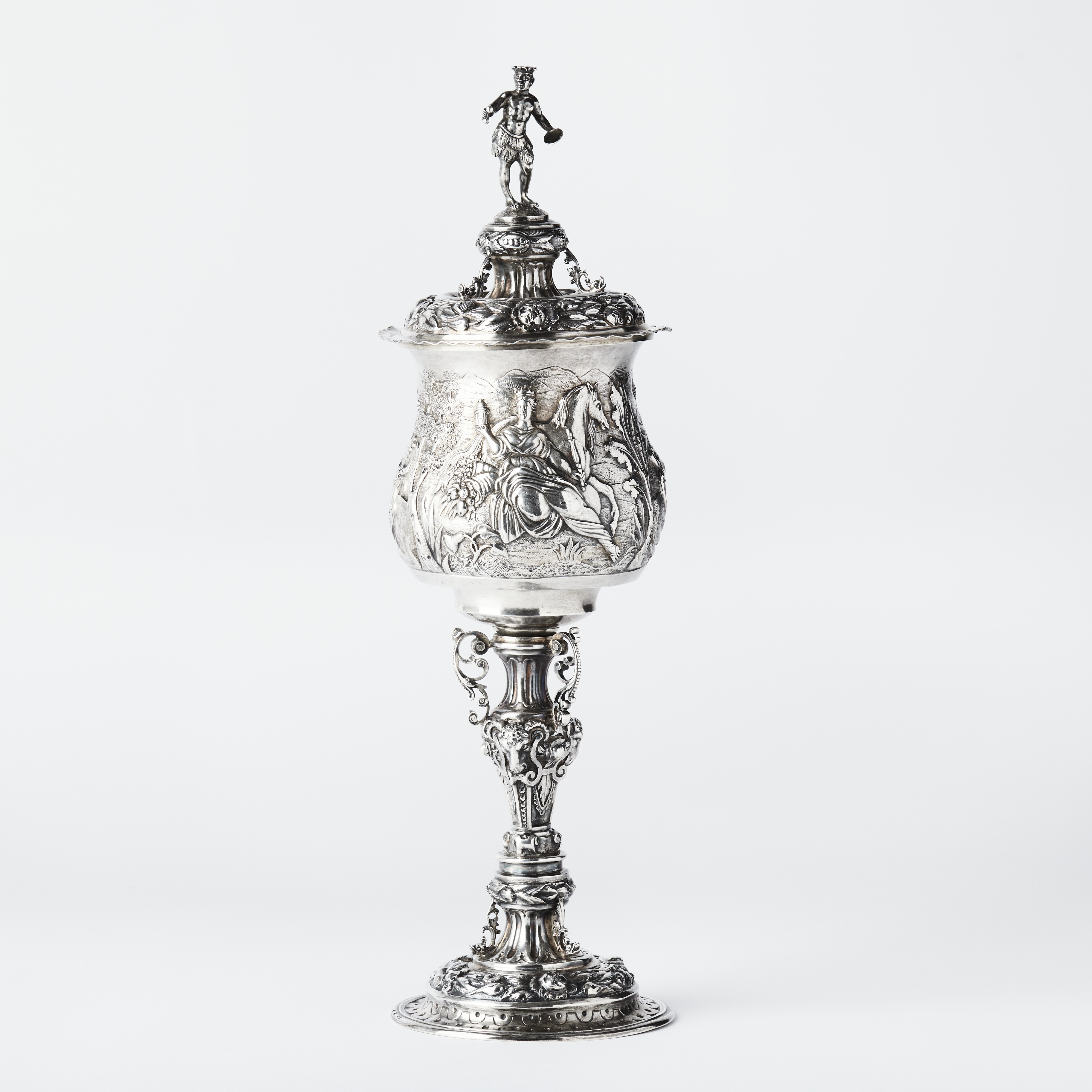 Кубок с крышкой, Германия, г. Ханау, 916 гр, 13 лотов, максимальная высота 42 см, высота по край 29,5 см, диаметр основания 12,2 см, диаметр верха 10,7 см