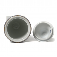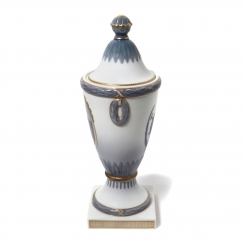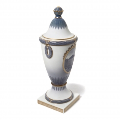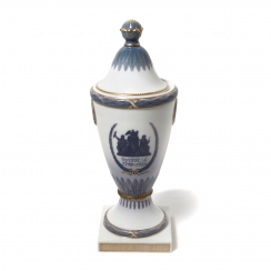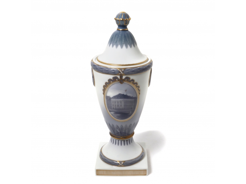 Фарфоровая ваза с крышкой, декорированная изображением королевский дворца Амалиенборг и надписью 4 апреля 1798-1923 гг. Ручная подглазурная роспись.