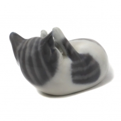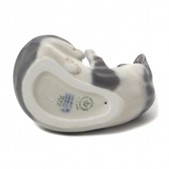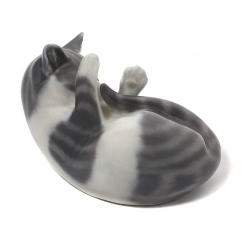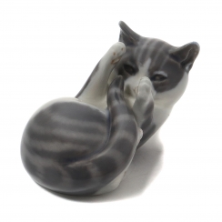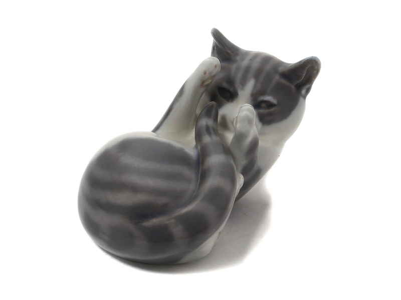 Фигура производилась также после объединения фабрик Royal Copenhagen и Bing & Grondahl (1985-1989) под брендом Royal Copenhagen, номер модели: 071. Даннаямодель встречается в двух видах росписи: 1026 - рыжий полосатый и 1025 - серый полосатый ============================== Porcelain figurine "Cat Playing". Hand-painted underglaze.