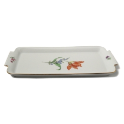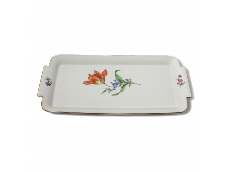Без сколов, реставраций и повреждений. ============================ Porcelain tray with two handles. A picturesque bouquet occupies the center of the tray. The dominant element is a large orange-red tulip, complemented by small blue and purple flowers, resembling forget-me-nots or lavender, and green leaves. The tray is decorated with small scattered flower sprigs and blades of grass. The edges of the tray and handle are accented with a thin polished gold rim. Pattern "Strewn Flowers". Hand-painted.