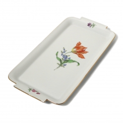 Фарфоровый поднос с двумя ручками. В центре расположен живописный букет. Доминирующим элементом является крупный оранжево-красный тюльпан, дополненный синими и фиолетовыми мелкими цветами, похожими на незабудки или лаванду, и зелеными листьями. Поднос украшен небольшими разбросанными цветочными веточками и травинками. Края подноса и ручки подчеркнуты тонким полированным золотым ободком. Дизайн "Рассыпанные цветы". Ручная роспись.