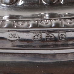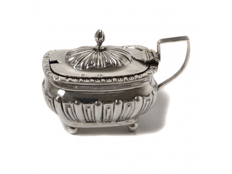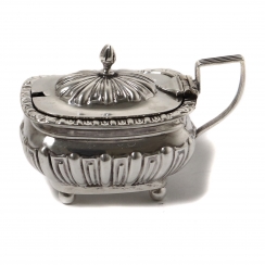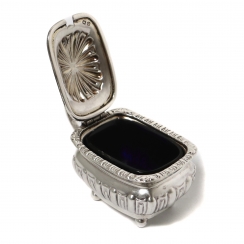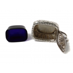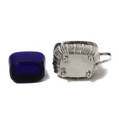 Максимальные размеры: 7,5 х 4,3 х 5,2 см. Вес без стеклянной вставки: 41 грамм серебра 925 пробы. ========================== Silver mustard pot with cobalt insert.
