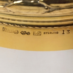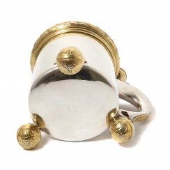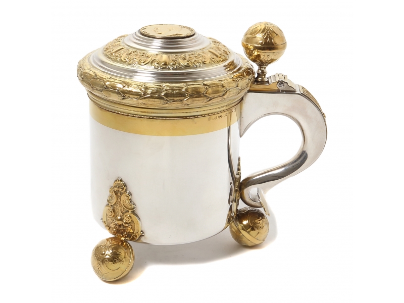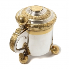 Серебряная кружка с откидной крышкой на ножках-шарах. Позолота. На крышке медальон с профилем короля Швеции Густава V (годы правления: 1907 - 1950) с надписью по кругу" Gustaf V Sveriges Konung".
