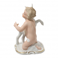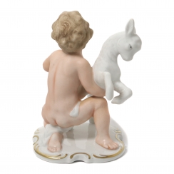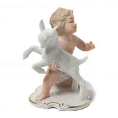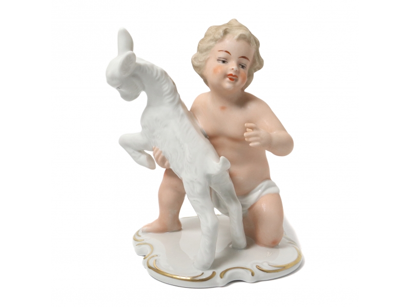 Фарфоровая фигура (статуэтка) "Обнаженный мальчик (путти) с козленком". Ручная роспись.