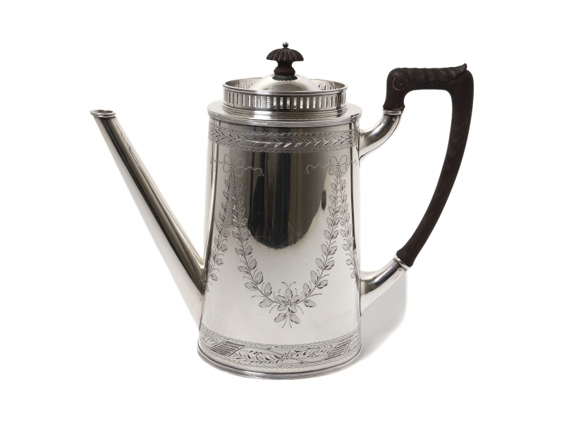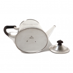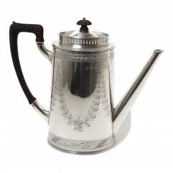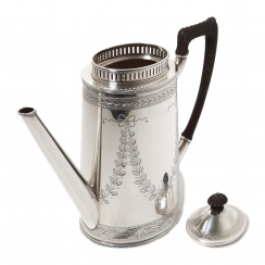 Высота по хватку на крышке: 21 см. Объём: 1200 мл. Общий вес: 636 граммов, серебро 826 пробы. =========================== Silver coffee pot, decorated with plant garlands.