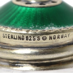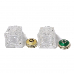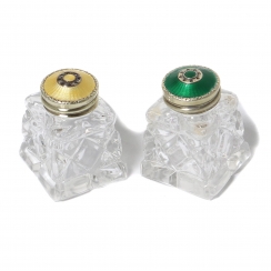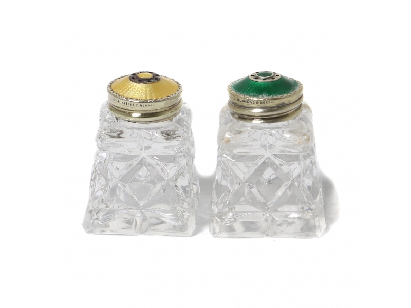 Солонка и перечница. Стекло, серебро 925 пробы, эмаль по гильоше.