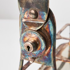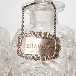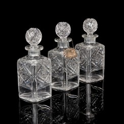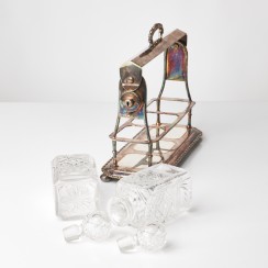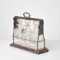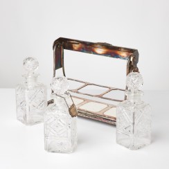 Винный погребец с тремя хрустальными штофами на посеребренной подставке (Тантал). Англия. Максимальные размеры подставки: длина 38,5 см, ширина 15,5 см, высота по верх ручки 32,5 см Максимальная высота штофов 24,5 см, размер основания 9 х 9 см, высота по край горла 17,7 см, внутренний диаметр горла 2,5 см ------------- на гранях хрусталя несколько мелких сколов, не влияющих на эстетические свойства изделий