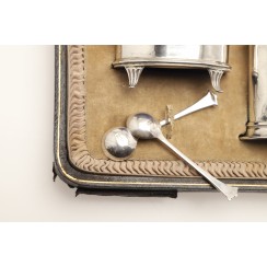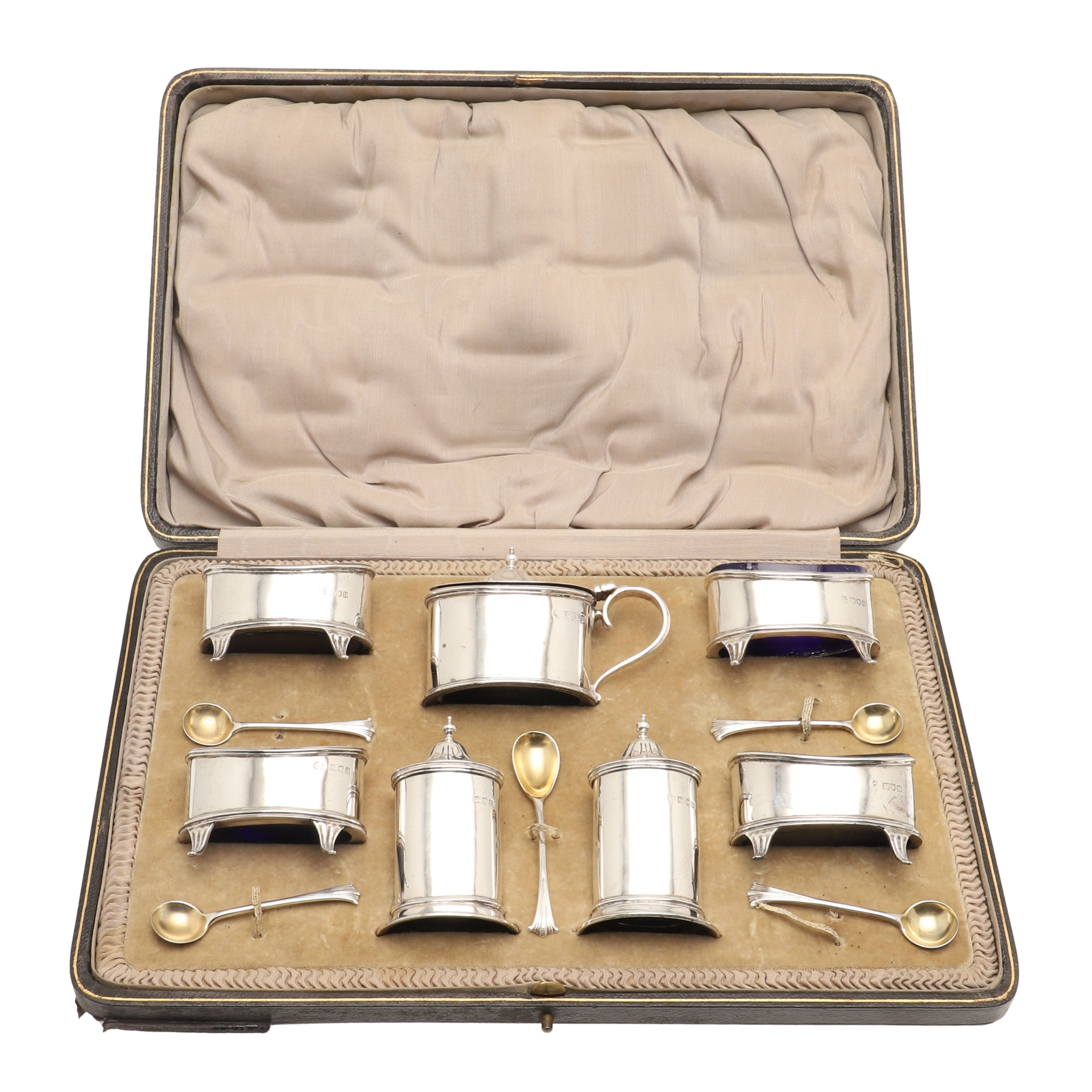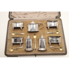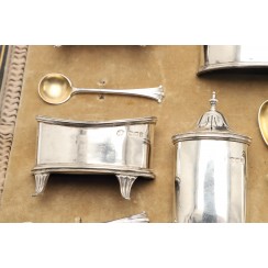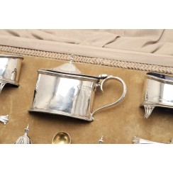 Набор для специй, 7 предметов, Англия, общий вес без стеклянных вставок 381 гр, 925 пр. В оригинальном футляре. Солонки, 4 шт, длина 6,8 см, ширина 3,8 см, высота 4,8 см Перечницы, 2 шт, высота 8,8 см, размеры основания 5 х 4 см Горчичница, высота по хватку на крышке 7 см, максимальная высота по край 4,7 см, размеры основания 6,5 х 4,3 см Ложки для соли, 4 шт, длина 7,3 см Ложка для горчицы, длина 8,8 см Размеры футляра 32,3 х 21,5 х 7 см (царапины, надрывы, потертости) на краях трех вставок имеется несколько микросколов