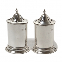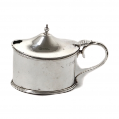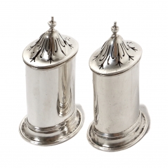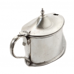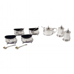 Salt shakers, 4 pcs., length: 6.8 cm, width: 3.8 cm, height: 4.8 cm. Pepper shakers, 2 pcs., height: 8.8 cm, base dimensions: 5 x 4 cm. Mustard pot, height (to grip on lid): 7 cm, maximum height at rim: 4.7 cm, base dimensions: 6.5 x 4.3 cm. Salt spoons, 4 pcs., length: 7.3 cm. Mustard spoon, length: 8.8 cm.