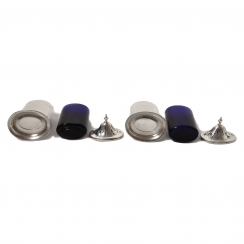Солонки, 4 шт, длина: 6,8 см, ширина: 3,8 см, высота: 4,8 см. Перечницы, 2 шт, высота: 8,8 см, размеры основания: 5 х 4 см. Горчичница, высота по хватку на крышке: 7 см, максимальная высота по край: 4,7 см, размеры основания: 6,5 х 4,3 см. Ложки для соли, 4 шт, длина: 7,3 см. Ложка для горчицы, длина: 8,8 см.