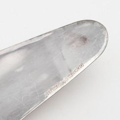![]() ![]() ![]() ![]() ![]() ![]() ![]() ![]() ![]() ![]() ![]() ![]() ![]() ![]() ![]() 345909 - Серебряная сервировочная лопатка. Швеция, 1977 годСеребряная сервировочная лопатка.Дизайн "Хильдесхаймская роза" (Rose of Hildesheim). Швеция, г. Мальмё, 1977 год, мастерская Gewe Silvervarufabriken (годы работы: 1939-1984). Длина: 24 см. Вес: 52 грамма серебра 830 пробы. ======================== Silver cake pie server (spatula). Pattern "Rose of Hildesheim". Sweden, Malmo, year 1977, workshop Gewe Silvervarufabriken (worked since 1939 to 1984). Length: 24 cm. Weight: 52 grams of silver 830 fineness. ![]() ![]() ![]() ![]() ![]() 302175 - Серебряная сервировочная ложка. Швеция, 1967 год.Серебряная сервировочная ложка.Дизайн "Хильдесхаймская роза" (Rose of Hildesheim). Швеция, г. Мальмё, 1967 год, мастерская Gewe Silvervarufabriken (годы работы: 1939-1984). Длина: 17 см. Вес: 30 граммов серебра 830 пробы. ======================= Silver serving spoon. Pattern "Rose of Hildesheim". Sweden, Malmo, year 1967, workshop Gewe Silvervarufabriken (worked since 1939 to 1984). Length: 17 cm. Weight: 30 grams of silver 830 fineness. ![]() ![]() ![]() ![]() ![]() 311096 - Серебряная сервировочная ложка. Швеция, 1951 годСеребряная сервировочная ложка в виде веточки.Швеция, г. Стокгольм, 1951 год, мастерская Ge-Kå-Smyckek G Kaplan (годы работы: 1945-1971). Длина: 10,8 см. Вес: 14 граммов серебра 830 пробы. ======================= Silver serving spoon in the form of a twig. Sweden, Stockholm, year 1951, workshop Ge-Kå-Smyckek G Kaplan (worked since 1945 to 1971). Length: 10.8 cm. Weight: 14 grams of silver 830 fineness. ![]() ![]() ![]() ![]() ![]() 293819 - Серебряные кондитерские щипцы. Швеция, 1944 годСеребряные кондитерские щипцы.Дизайн "Хильдесхаймская роза" (Rose of Hildesheim). Швеция, г. Стокгольм, 1944 год, мастерская Hultman A/B J L (годы работы: 1920-1957). Длина: 13,5 см. Вес: 23 грамма серебра 830 пробы. ========================= Silver pastry tongs (pastry server). Pattern "Rose of Hildesheim". Sweden, Stockholm, year 1944, workshop workshop Hultman A/B J L (worked since 1920 to 1957). Length: 13.5 cm. Weight: 23 grams of silver 830 fineness. ![]() ![]() ![]() ![]() ![]() 301090 - Серебряные пепельницы, 5 шт. Швеция, 1965 годСеребряные банкетные пепельницы, 5 шт.Швеция, г. Стокгольм, 1965 год, мастерская Skandia-Hultman-Kommanditbolag (годы работы: 1957-1971) и мастерская Stiltenn Sven Carlsson (годы работы: 1940-1976). Длина: 6 см, ширина: 4,6 см, высота: 1 см. Общий вес: 111 граммов серебра 830 пробы. ======================== Silver banquet ashtrays, 5 pcs. Sweden, Stockholm, year 1965, workshop Skandia-Hultman-Kommanditbolag (worked since 1957 to 1971) and workshop Stiltenn Sven Carlsson (worked since 1940 to 1976). Length: 6 cm, width: 4.6 cm, height: 1 cm. Total weight: 111 grams of silver 830 fineness. ![]() ![]() ![]() ![]() ![]() |