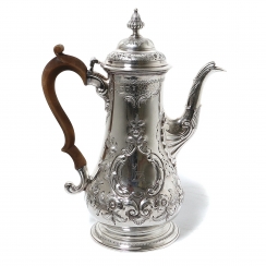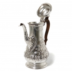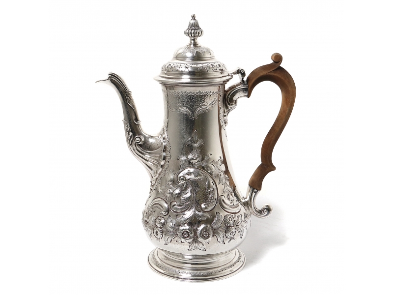 Серебряный кофейник, декорирован цветочным и лиственным орнаментом.