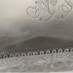 На крышке точечная вмятинка, на гранях хрусталя несколько микросколов. С вензелем. ============================= Crystal box (casket) with silver lid.
