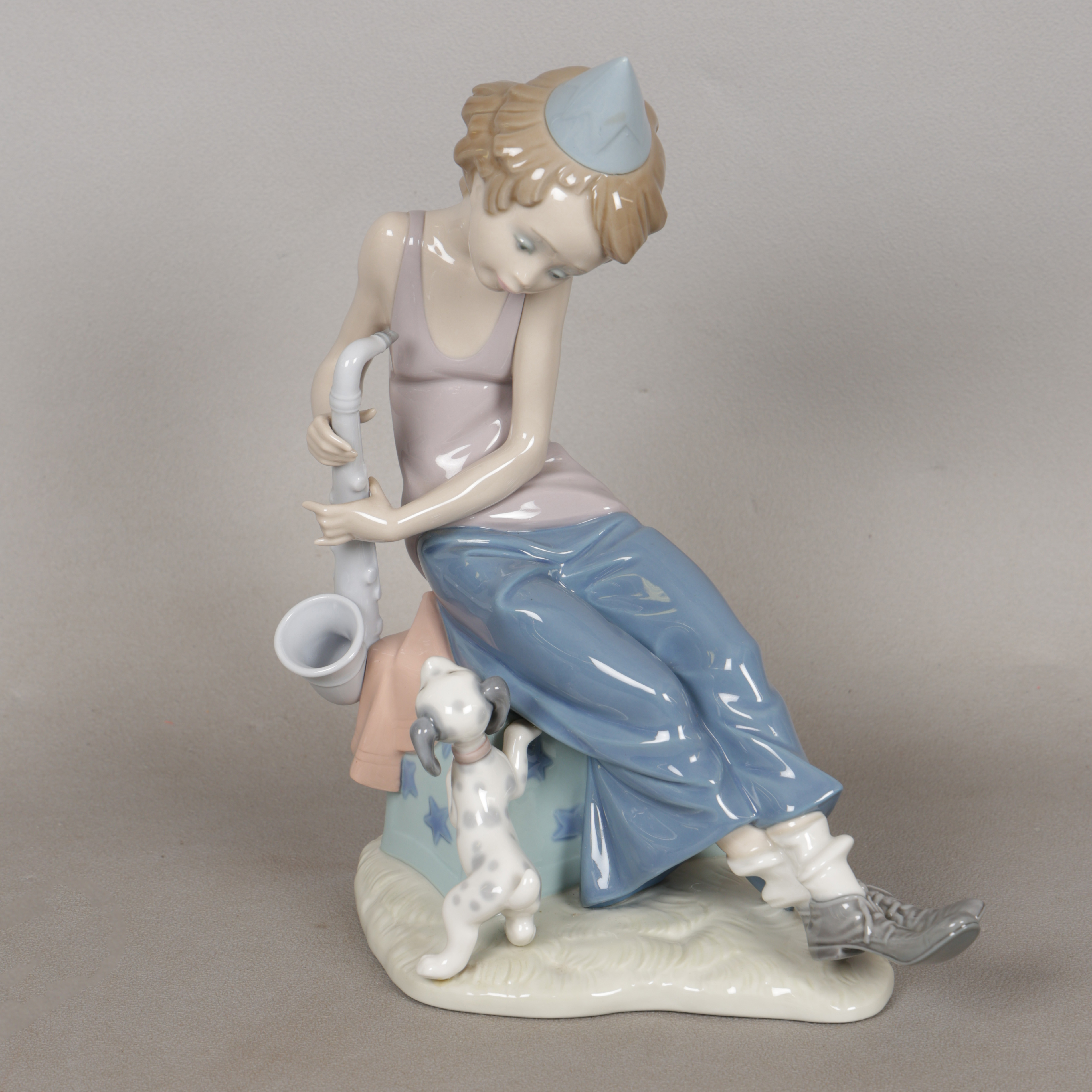 382953 - Мальчик - клоун с саксофоном и щенок, высота 26 см, максимальная длина 24 см, ширина 14 см, Испания, Lladro