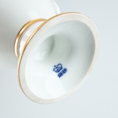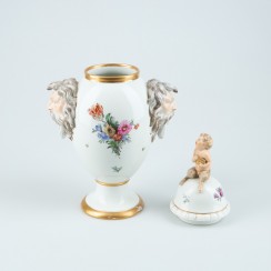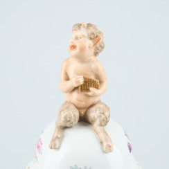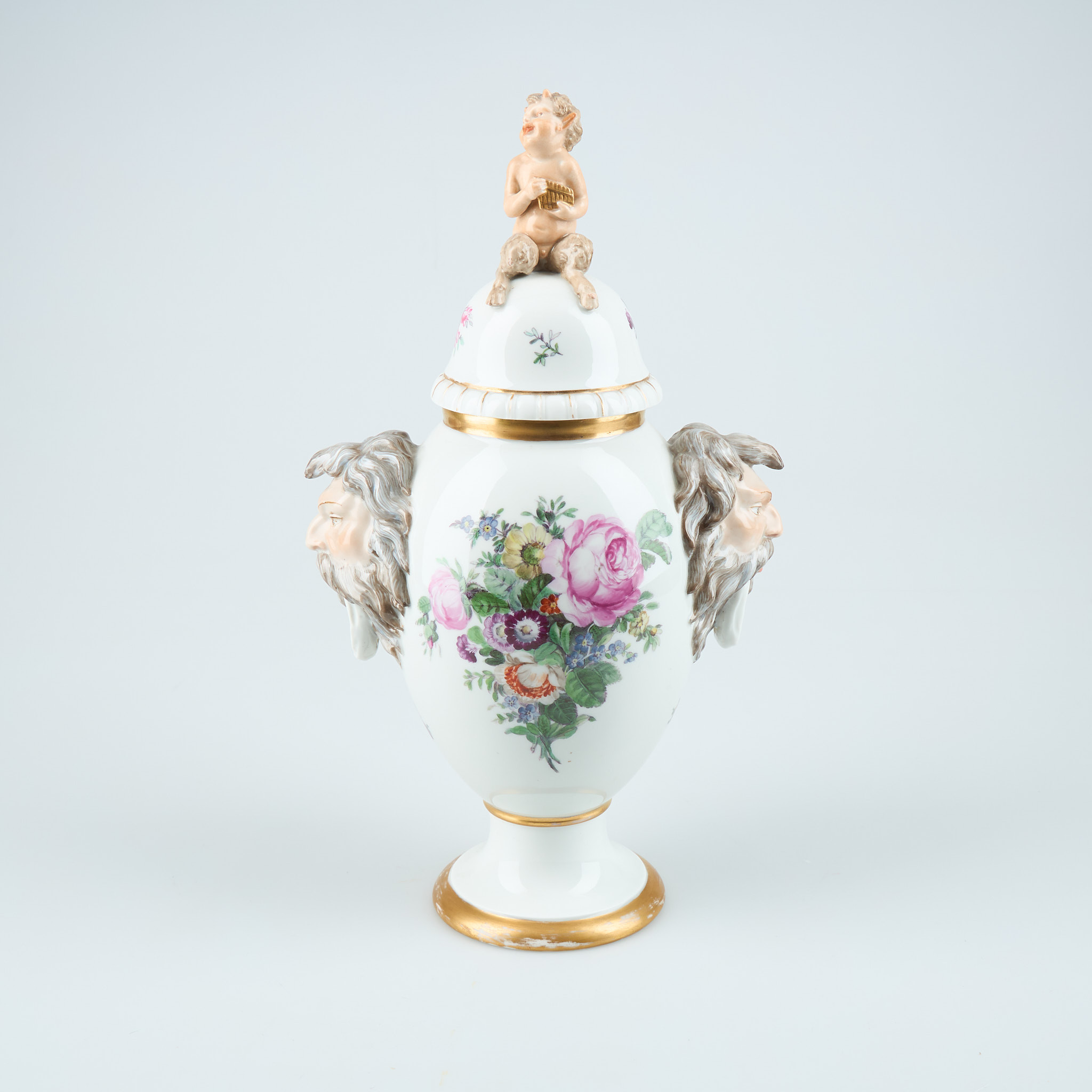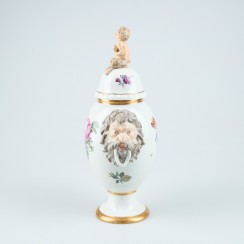 | Фарфоровая ваза с крышкой, с двух симметричных сторон декорирована горельефными маскаронами, с двух других - пышными букетами (ручная роспись); крышку венчает объемная фигурка фавна с панфлейтой.