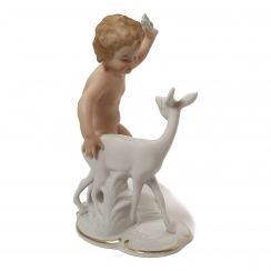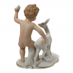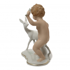 Фарфоровая фигура (статуэтка) "Обнаженный мальчик (путти) с косулей". Ручная роспись.