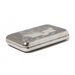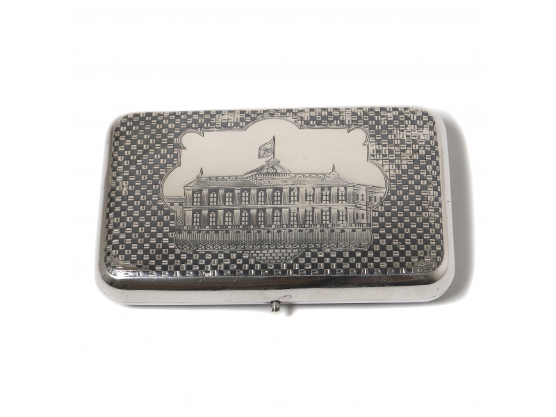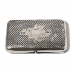 Пробирные российские клейма до 1899 года, где: "ВС" - инициалы пробирного мастера Савинкова Виктора (годы работы: 1859-1894); цифра "18?4" указывает год клеймения; цифра "84" удостоверяет, что изделие выполнено из серебра 84 золотниковой пробы; "Георгий Победоносец" - клеймо города Москвы. =========================== Silver cigarette case, decorated with niello drawing.