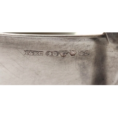Высота: 4,2 см, диаметр верха: 6,5 см. Объем: 45 мл. Общий вес: 193 грамма серебра 830 пробы.